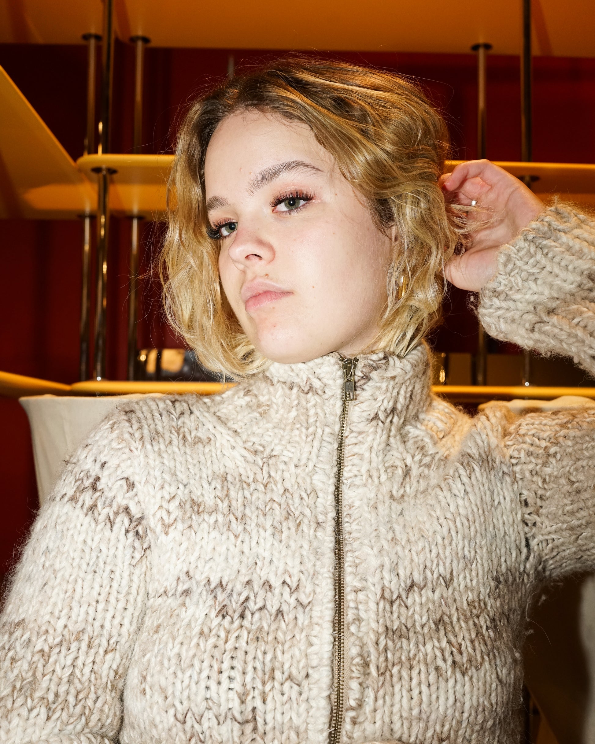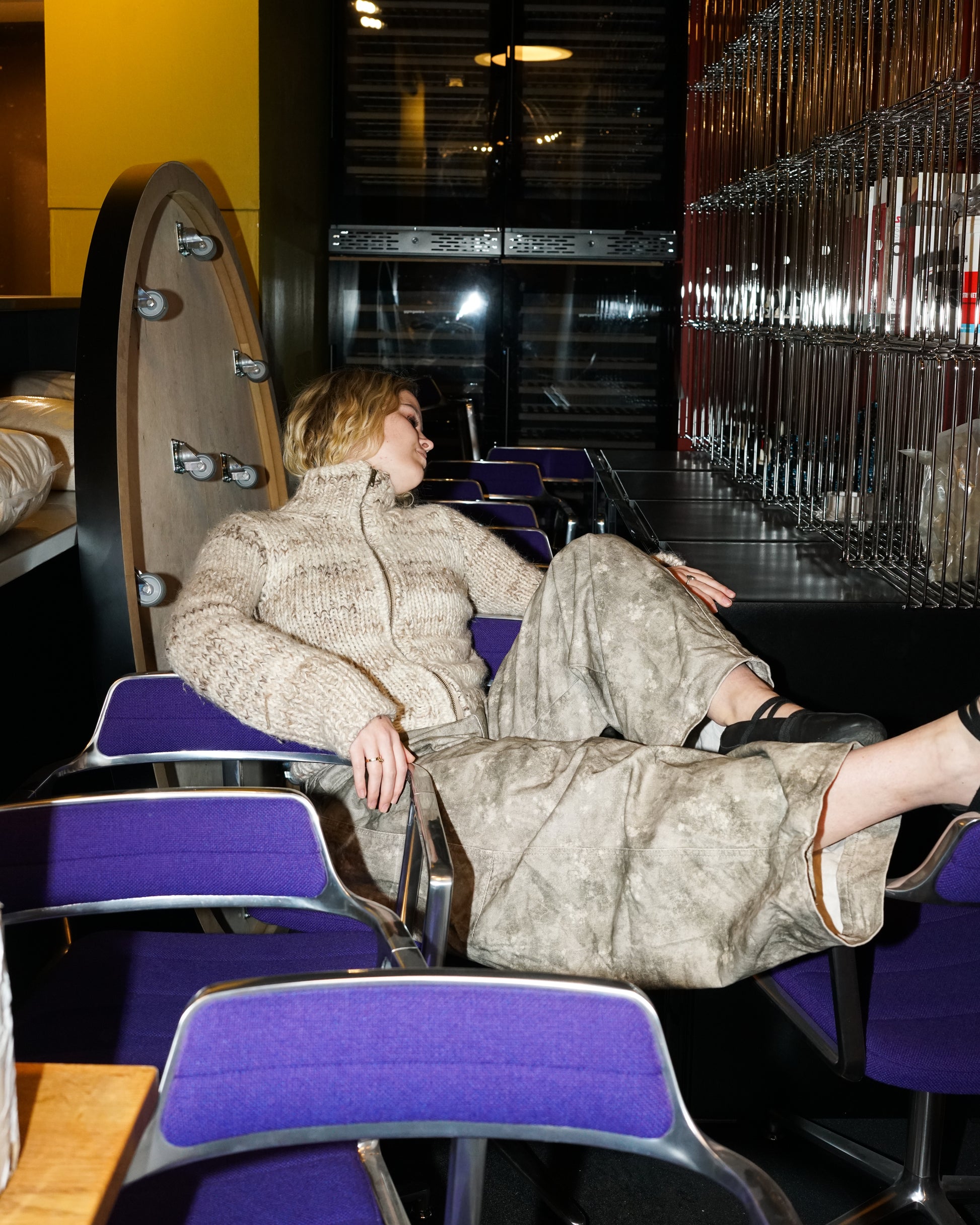 Derudover er der brugt forskellige brunlige nuancer af mohair og brushed alpaca, som er tilfældigt integreret i sweateren for at skabe farvespil.